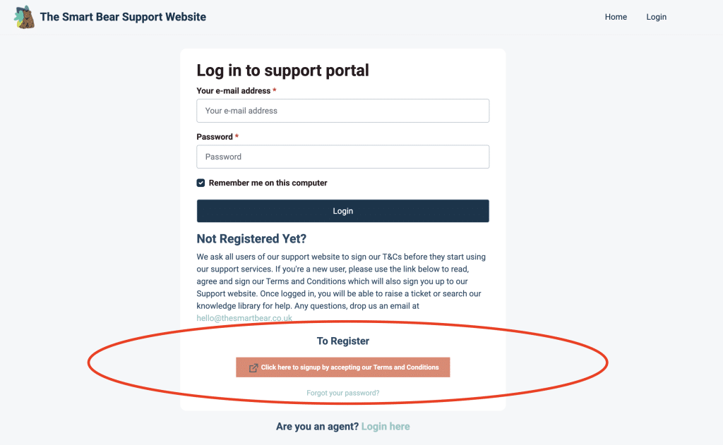 When you go to the page – you should see the screen below. From here you can sign up for a new account using the big orange button, or log in if you’re already registered… If your’e a new user, you’ll need to read and sign our Terms and Conditions first which is where you’ll go when you click the orange button, ringed in the screenshot below.